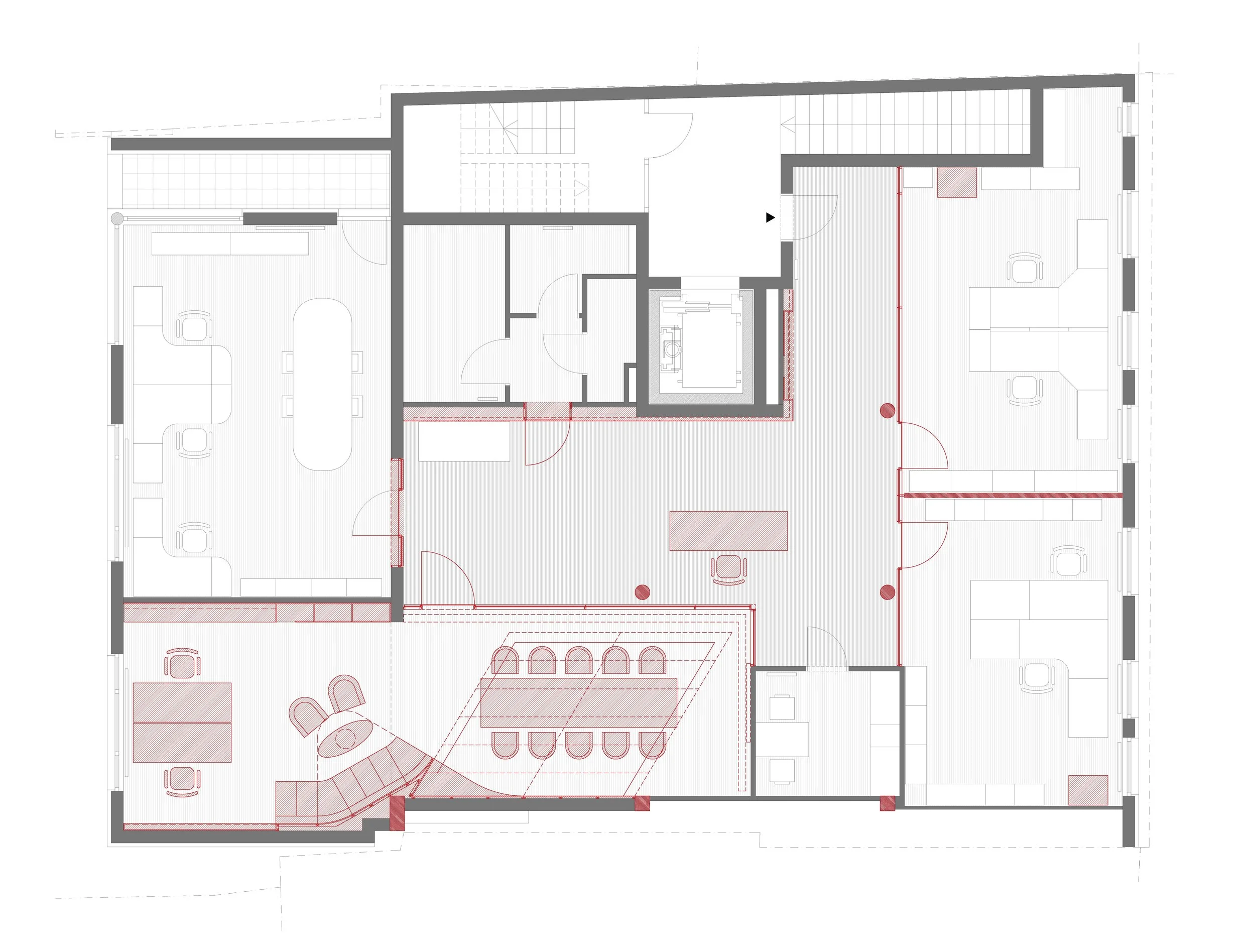 The partial refurbishment within an existing residential building was to provide a common lobby, three office spaces, an executive office and a representative conference room. A time-use consideration showed us a striking discrepancy regarding the use of the conference room: occupied by far the least time this room was to be the most elaborate in both material and equipment of the entire office. Correspondingly, it was known that the executive office, shared by the two CEOs of the company, was also only sporadically occupied. Therefore, we opted to present the conference room rather than hide it and interlock it with the executive office into one spatial unity. A small informal meeting corner forms a hinge between the two parts of the space. In addition, this arrangement allows daylight to enter the center of the building via the executive office. The exhibition of a space within a larger spatial context can be read as the staging of organizational operations. The conference room thus forms the spatial center of the office and performs its role as a representative framework for the company’s team effort.