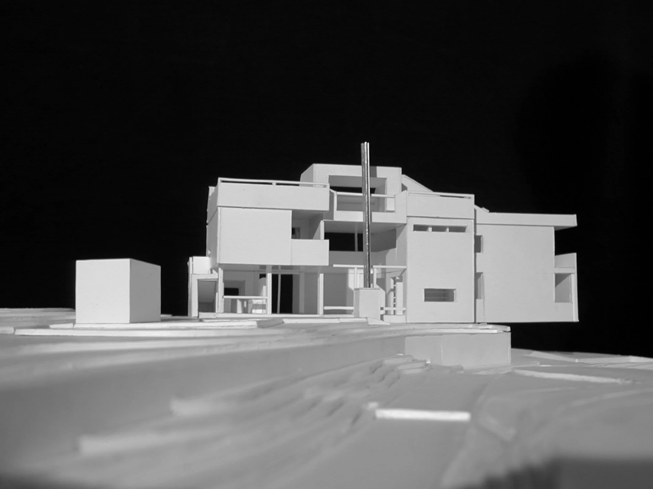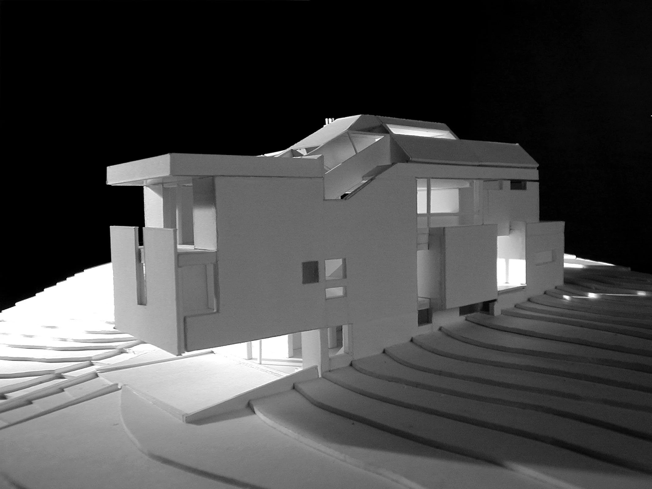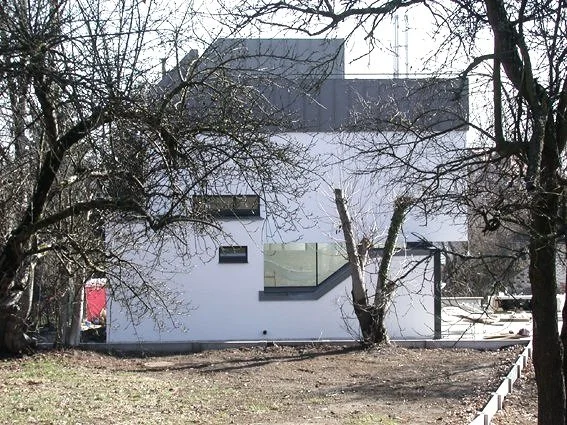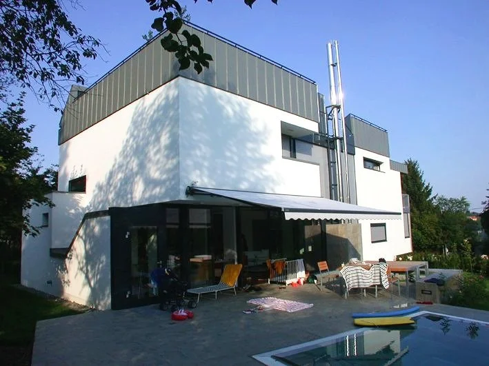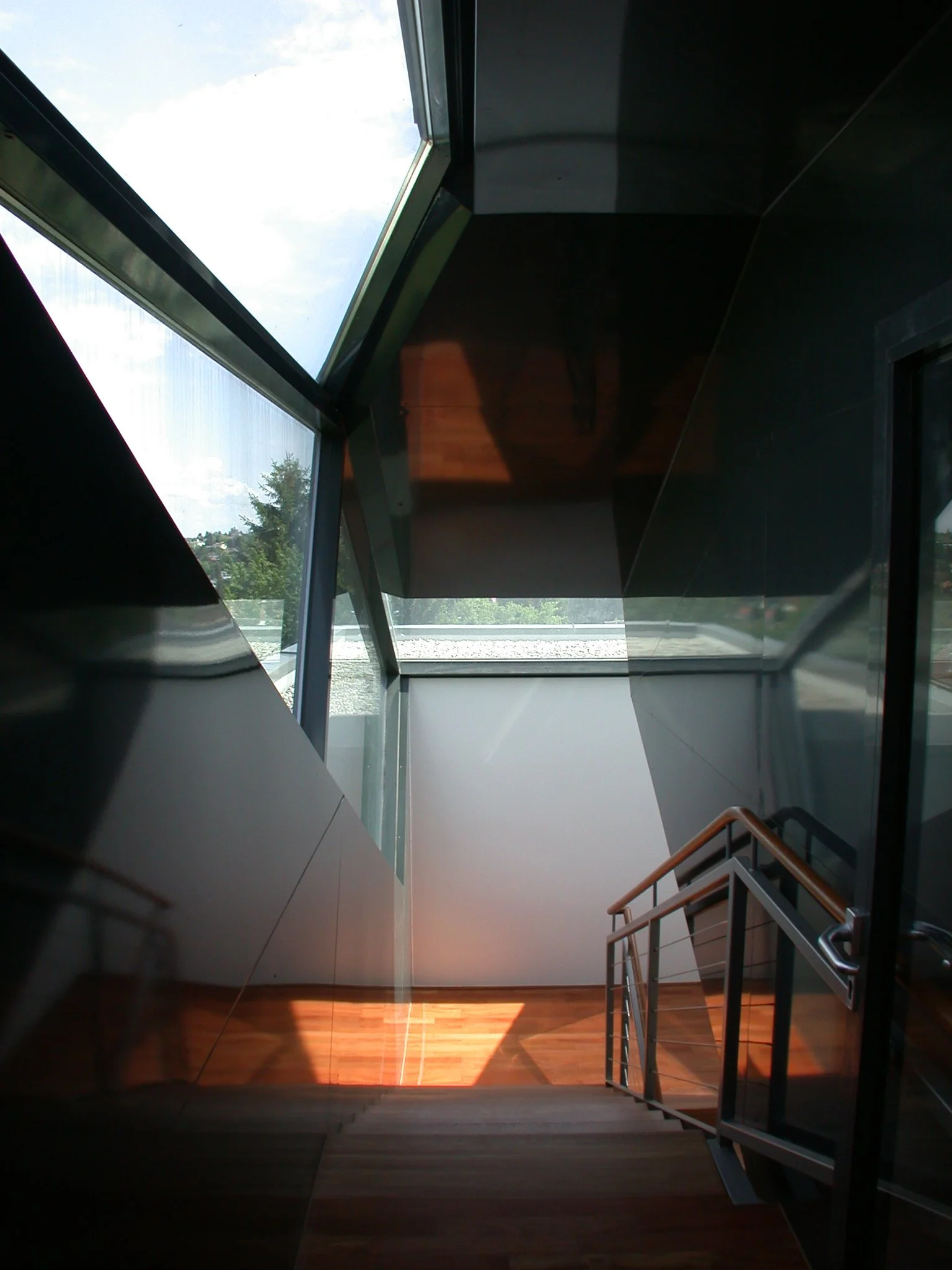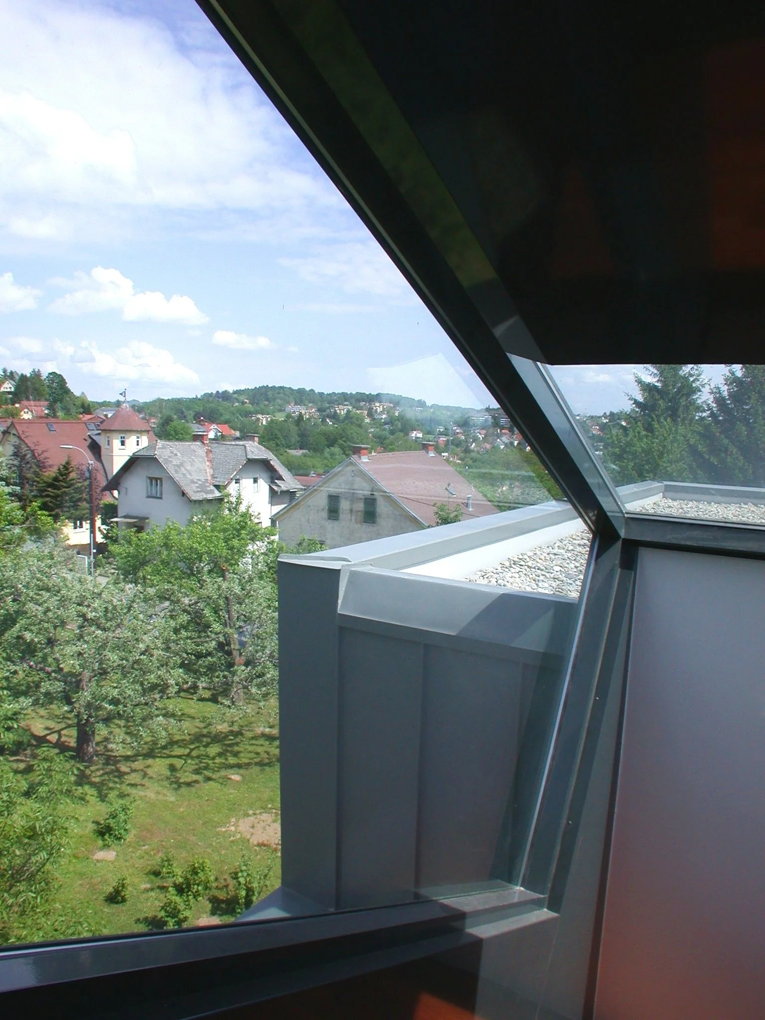 Squeezed into a small lot in a noble residential area of the city of Graz in Austria, this house for a radiologist and his family bulges and contorts itself to fulfill the demands of the program: the normal requirements of a house, plus gym, sauna, reading room, separate TV-room, rooftop office and roof terrace, swimming pool and garden hut. The building completely maximizes the zoning set back regulations in every direction, and ultimately cantilevering the building, a move that accommodates a carport. On the interior the central double height living room joins all of the spaces in the house.